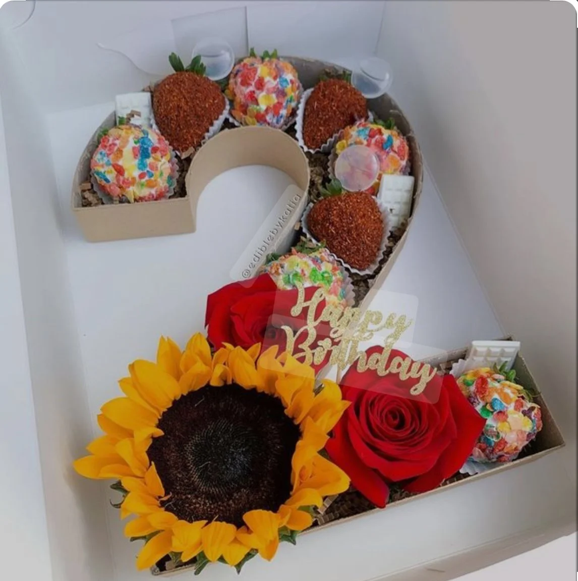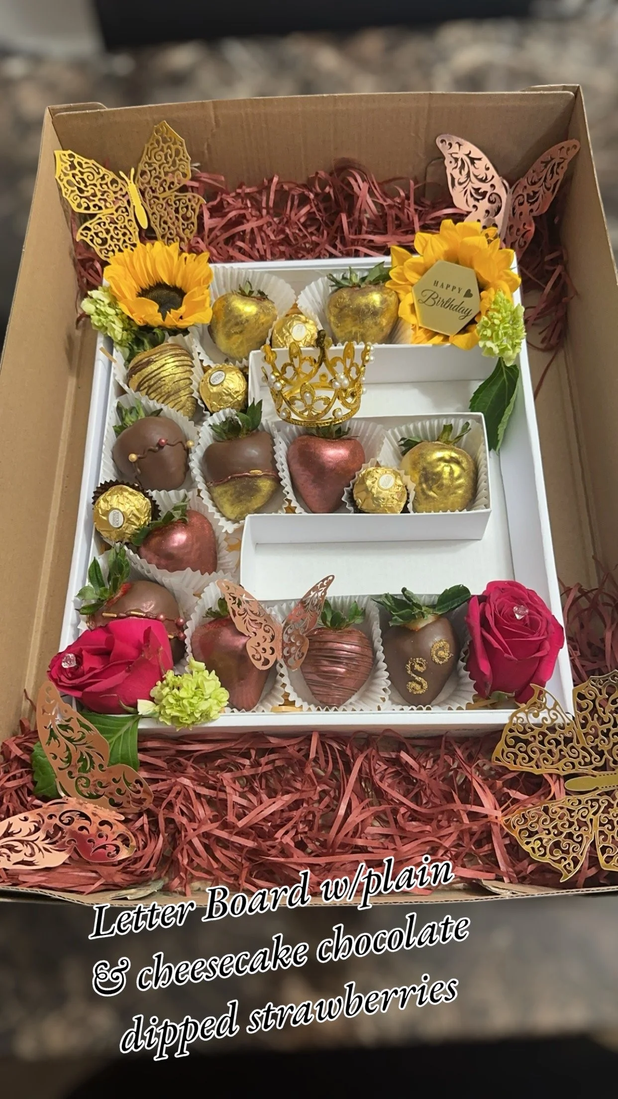With this service you can choose from multiple treats to have placed into 1 or 2 large letters or number charcuterie boards. Choice of strawberries (cheesecake or not) and a variety of flavored cupcakes.